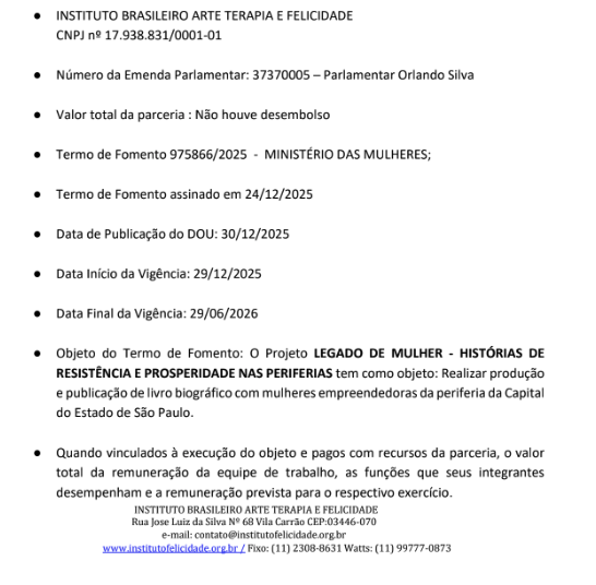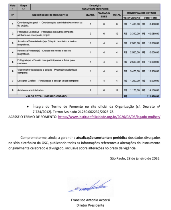 "Disponibilizamos, para cumprimento dos critérios de transparência, os documentos relativos ao Termo de Fomento do projeto 'Acelera Mulher — Aceleração e Mentoria para Mulheres Empreendedoras e Lideranças Sociais'. A íntegra dos documentos está disponível no link abaixo."